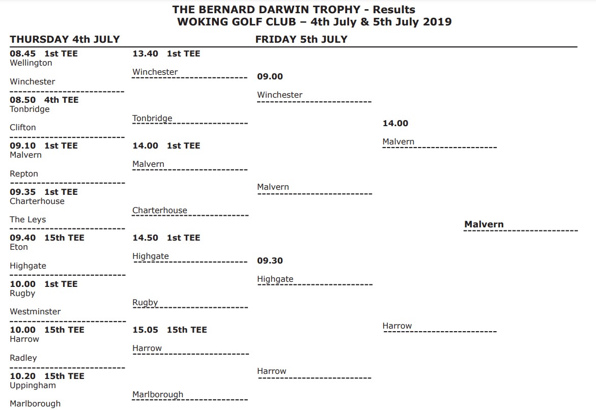Malvern won the Bernard Darwin in 2019 with the following results. Bernard Darwin 2019 Results Sheet.